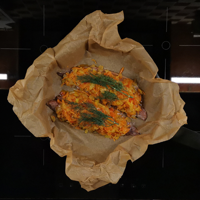 Теперь начнется самое интересное. На чистую сковороду укладывается качественная пекарская бумага, которая предотвратит прилипания. На нее помещается скумбрия шкуркой вниз, затем сверху укладываются обжаренные овощи с параллельной укропной веточкой. Все это накрывается крышкой и готовится на среднем огне в течение 15 минут. Несмотря на простоту, этот метод гарантирует сохранение всей влаги и аромата продукта.