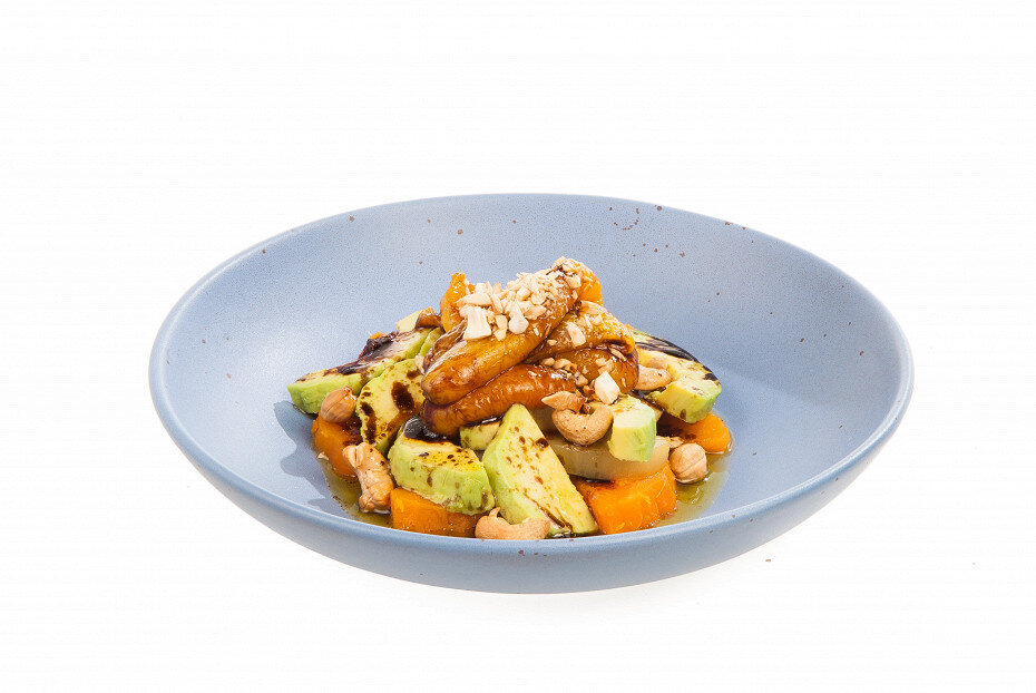 Следующим шагом идет очищение киви и авокадо, которые нарезают полукольцами. Чтобы авокадо не потемнело, его рекомендуется сбрызнуть лимонным соком. Как только батат остынет, его очищают от кожуры и режут на кубики. Для хрустящей текстуры орехи кешью запекают в духовке в течение 10 минут при температуре 180 градусов.