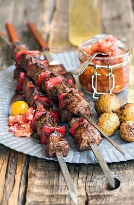 Жарьте шашлык на углях, часто переворачивая, около 4 минут. После этого дайте ему постоять 10 минут на блюде. Затем доведите до желаемой степени готовности, жаря еще 3–6 минут. Перед подачей дайте мясу «отдохнуть» 5 минут. Подавайте с острой сальсой и наслаждайтесь вкусом!