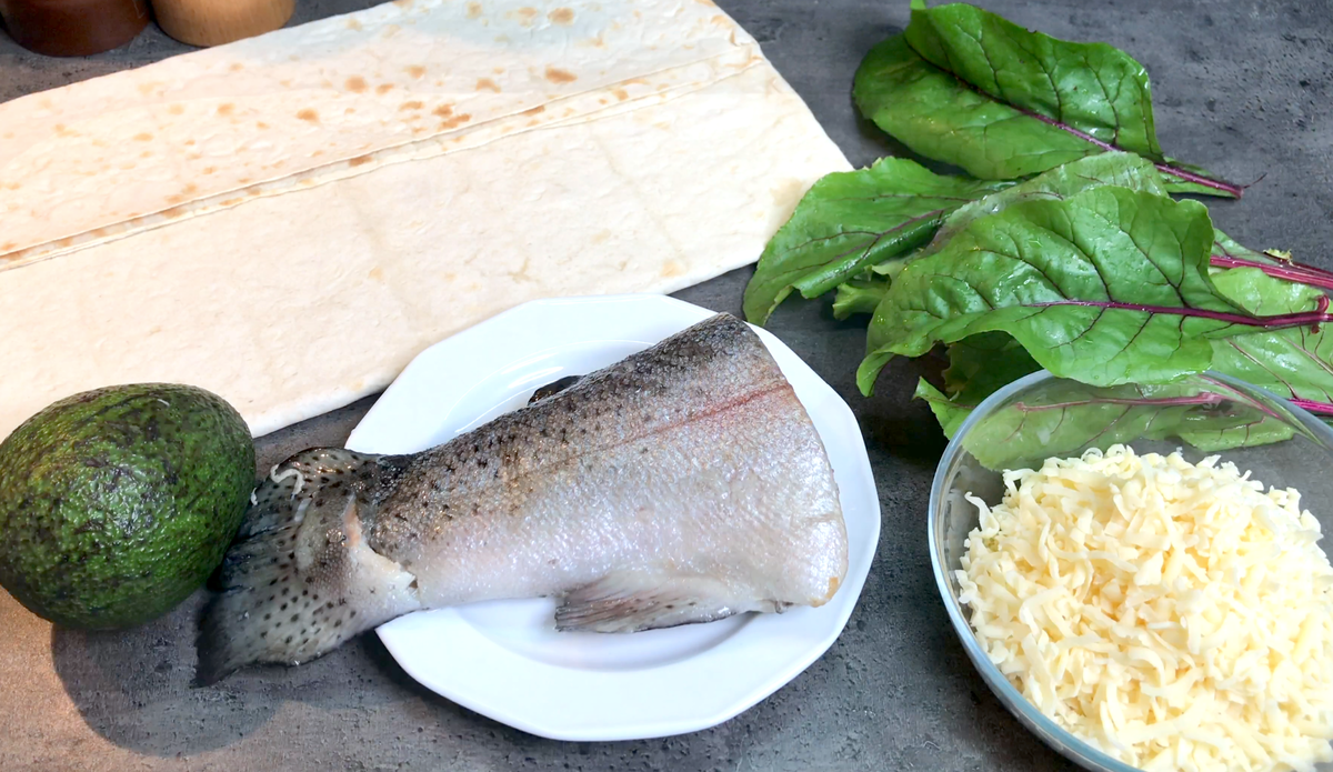 Начнем с основного: на лаваше разместить листья любого салата, а затем добавьте кусочки рыбного филе. Рекомендуется использовать жареную или запеченную красную рыбу — форель или горбушу. Если рыба не в вашем вкусе, отличной альтернативой станет ветчина.