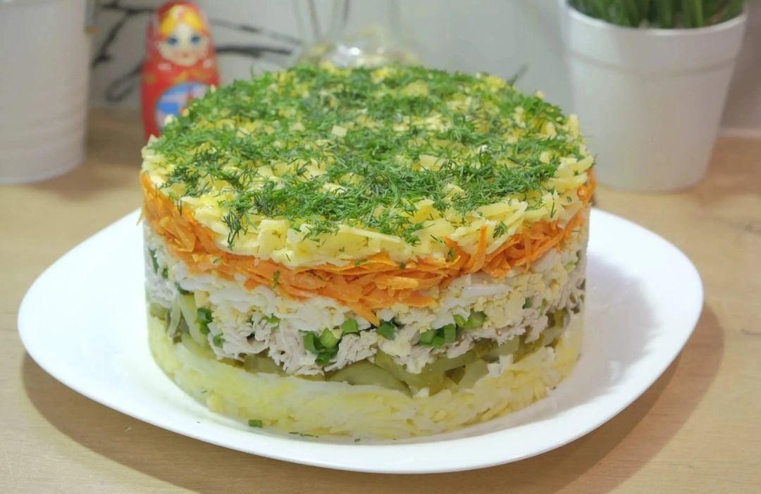 Этот вкусный слоёный салат, в котором восхитительно сочетаются курица и маринованные огурцы, станет настоящим украшением любого застолья. Необходимые ингредиенты легко найти на кухне, а сам процесс приготовления не займет много времени.