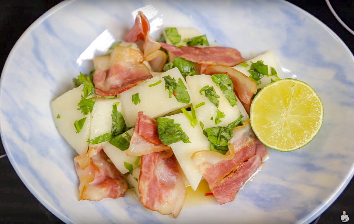Теперь соединим соус с нарезанной дыней и аккуратно выложим на тарелку. Сверху разместим крупные кусочки бекона.