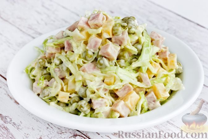 Салат из капусты с ветчиной, сыром и горошком может показаться простым, но его вкус и текстура удивляют. Хрустящая капуста, консервированный горошек, ветчина и сыр идеально сочетаются друг с другом и готовятся всего за 10 минут!