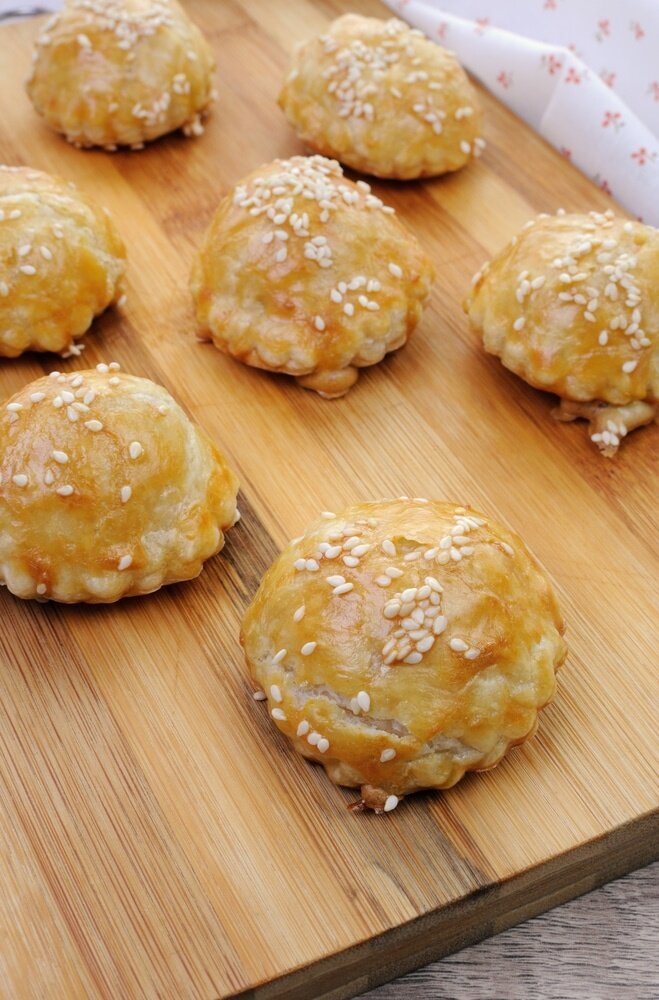 Смазать сверху яичной смесью и посыпать кунжутом. Поместить в разогретую духовку.