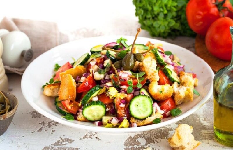 Нарезать хлеб, сбрызнуть оливковым маслом и поджарить в духовке до золотистого цвета. Для заправки измельчить чеснок, базилик и каперсы, затем смешать с оливковым маслом и уксусом. Все свежие овощи нарезать, добавить руколу и маслины, перемешать с обжаренным хлебом и полить заправкой.