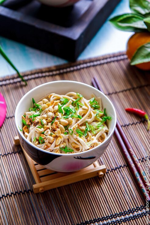 После того как лапша будет готова, слейте воду и смешайте её с соусом. Разложите по тарелкам и посыпьте нарезанным арахисом и зелёным луком. Можно добавить пару капель кунжутного масла для усиления аромата.