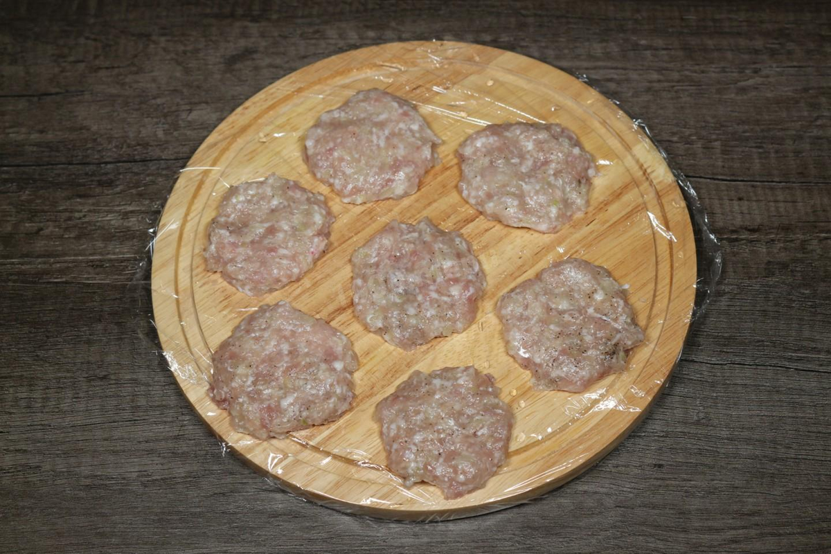 Шаг 1: Начните с приготовления мясной начинки. Лук очистите и измельчите одну половинку. В фарш добавьте лук, соль и перец, тщательно перемешайте. Формируйте 10 небольших лепешек и положите их в холодильник под пленку.
