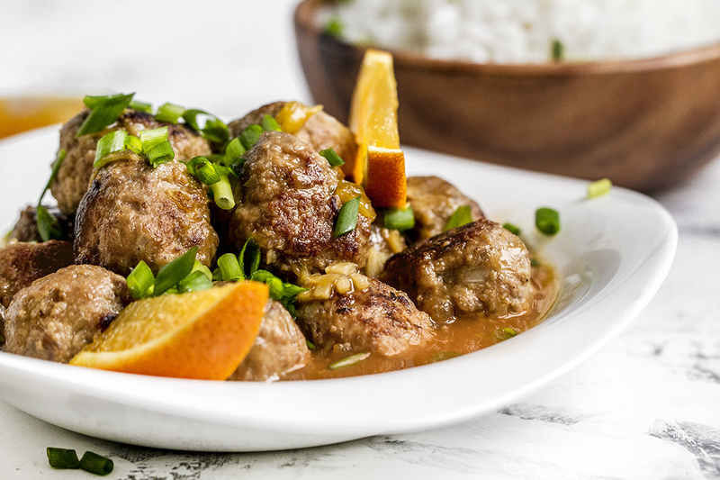 Шаг 4: Для соуса натрите очищенный имбирь на мелкой тёрке. В отдельную миску выжмите сок апельсина, добавьте соевый соус, мёд, натёртый имбирь и кукурузный крахмал. Влейте 50 мл холодной воды и тщательно перемешайте. Затем влейте соус к фрикаделькам и готовьте под крышкой ещё 3-4 минуты на среднем огне. Подавайте блюдо горячим.