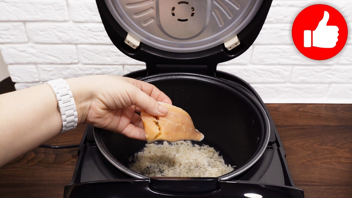 2. Затем добавляется филе рыбы, которое укладывается поверх риса. Не забудьте о специях: посолите и поперчите по вкусу.