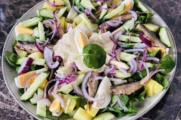- Слоеный салат со шпротами: Попробуйте собрать этот салат слоями, используя картофель, яйца, морковь и шпроты. Каждый слой можно смазать майонезом, что придаст блюду неповторимый вкус.