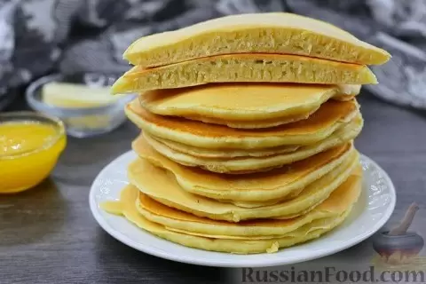 - Панкейки на кефире: Мягкие и воздушные, быстро готовятся. Для подачи отлично подойдут мёд, варенье или сливочное масло.