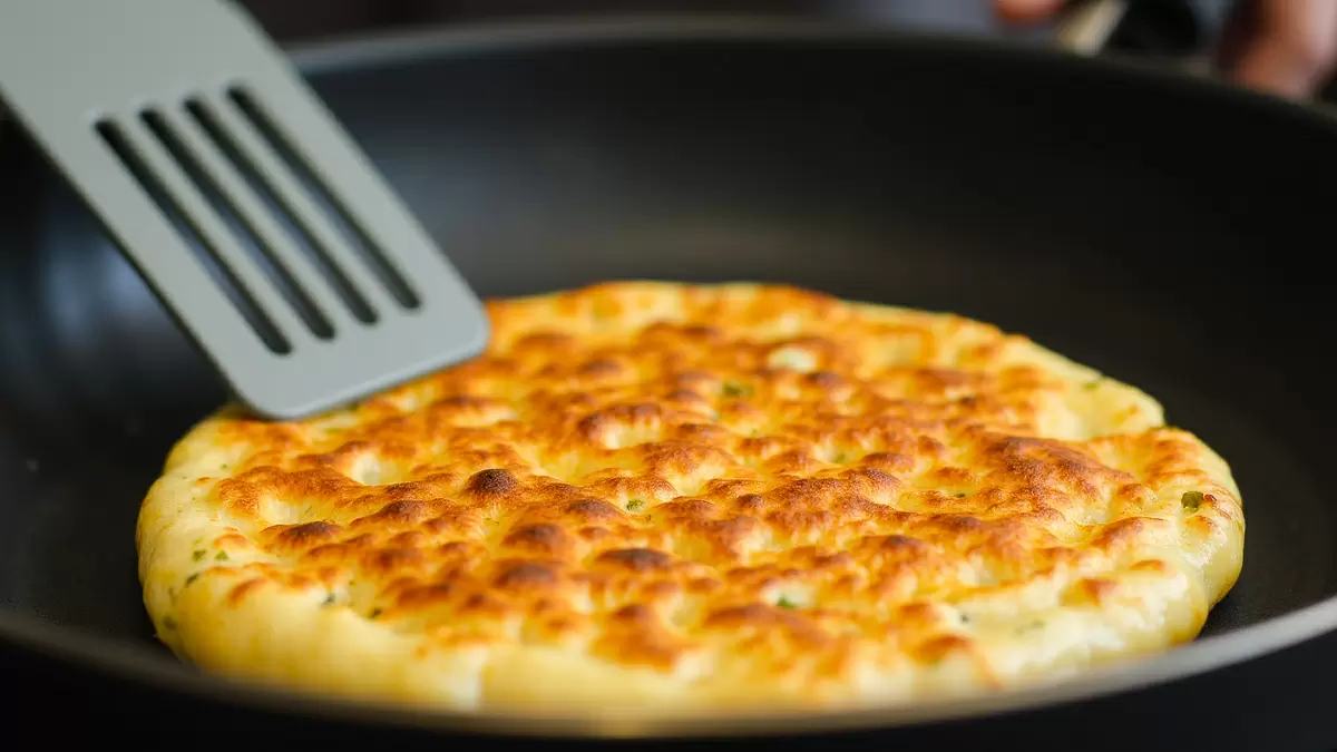 Разогревают антипригарную сковороду и слегка смазывают растительным маслом. В сковороду выкладывают тесто, равномерно распределяя его по поверхности. Обжаривают лепешку по 20 секунд, периодически переворачивая, пока она не начнет надуваться и не приобретет золотистый цвет. Готовую лепешку дополнительно смазывают растительным маслом и обжаривают еще несколько секунд для золотистой корочки. Затем доставляют ее на сервировочное блюдо, готовую к подаче на стол.
