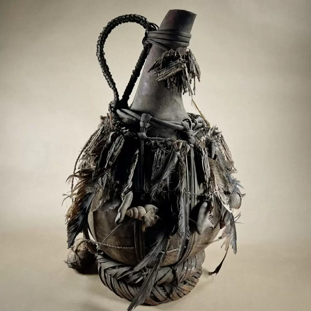 Сегодня внимание привлекает необычный кувшин, выполненный из тыквы-калебаса и насыщенный ритуальными атрибутами. Этот яркий экземпляр является частицей богатой духовной и гадательной традиции региона.