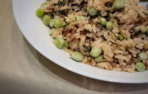 Далее рис отваривается до полного приготовления, пока вся жидкость не впитается. После варки его стоит оставить настояться при комнатной температуре в течение нескольких минут, а затем взрыхлить вилкой. Если используется свежий горошек, его достаточно обдать горячей водой. В случае морозного, его следует опустить в кипяток на одну минуту для размягчения.