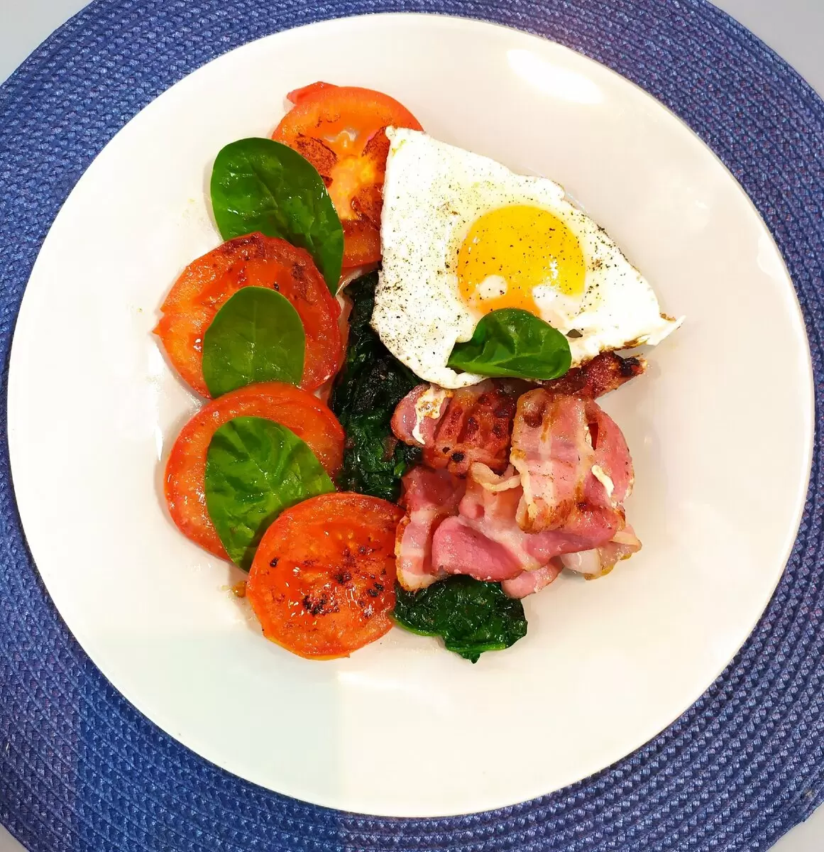 Начните с того, что на сковороде с растительным маслом обжарьте яйцо, добавив по вкусу немного соли и перца. Рядом, не смешивая, расположите нарезанные кружочками помидоры, шпинат и бекон. Жарьте до золотистой корочки, чтобы все ингредиенты раскрыли свой вкус.