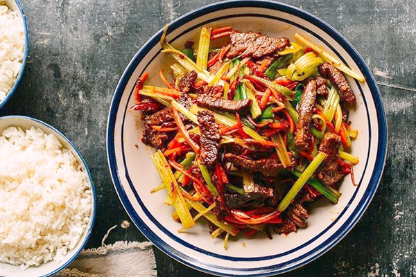 Уменьшить огонь, добавить ещё столовые ложки масла и обжарить имбирь, после чего ввести пасту доубаньцзян. Готовить до получения красного масла, затем добавить сельдерей, морковь и обжаренную говядину. Увеличить огонь и быстро перемешать все ингредиенты.