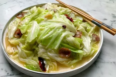 Разделите листья капусты на крупные куски, а колбаски нарежьте тонкими ломтиками. Чеснок и сушеные чили порежьте крупно.В отдельной миске разведите кукурузный крахмал с водой.На раскаленной сковороде сначала разогрейте смалец и растительное масло, а затем положите колбаски и обжаривайте около минуты.Добавьте чеснок, дождитесь его аромата, и только потом всыпьте сычуаньский перец и чили.После того как вы почувствуете аромат перца, добавьте капусту и активно перемешивайте, пока она не уменьшится в объеме (это займет около минуты).Влейте куриный бульон, посолите и тщательно перемешайте. Накройте крышкой и тушите пару минут.Снимите крышку, еще раз перемешайте разведенный крахмал и аккуратно добавьте его в соус, постоянно помешивая. Дайте соусу загустеть в течение 20-25 секунд, затем можно снимать с огня.Приятного аппетита!