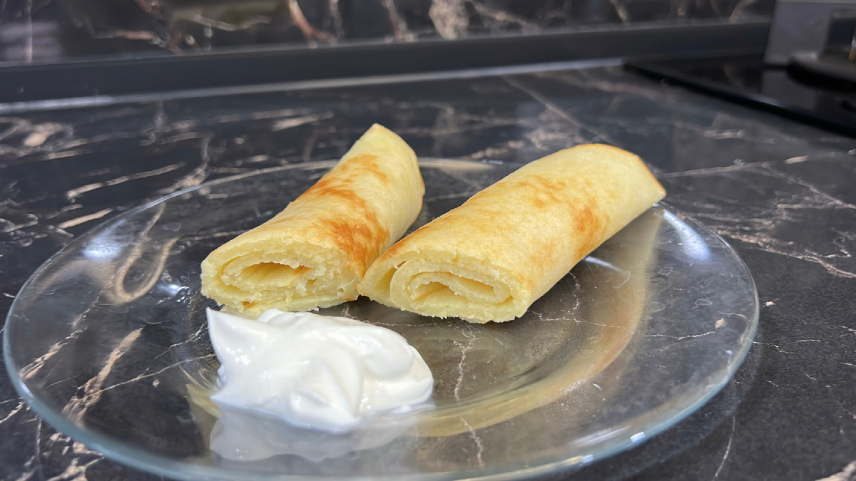 Блины с творогом: Для этого варианта потребуются 4 яйца, 3 стакана молока, 2,5 стакана муки, 2 ст. ложки сахара, 1 ч. ложка соли, 2 ч. ложки разрыхлителя и 200 г творога. Взбейте яйца с сахаром и солью до состояния пены. Постепенно добавляйте молоко и муку, тщательно перемешивая. Затем введите разрыхлитель и творог, и снова хорошо перемешайте. Жарьте как в предыдущем рецепте, подавайте с медом чи сладким соусом.