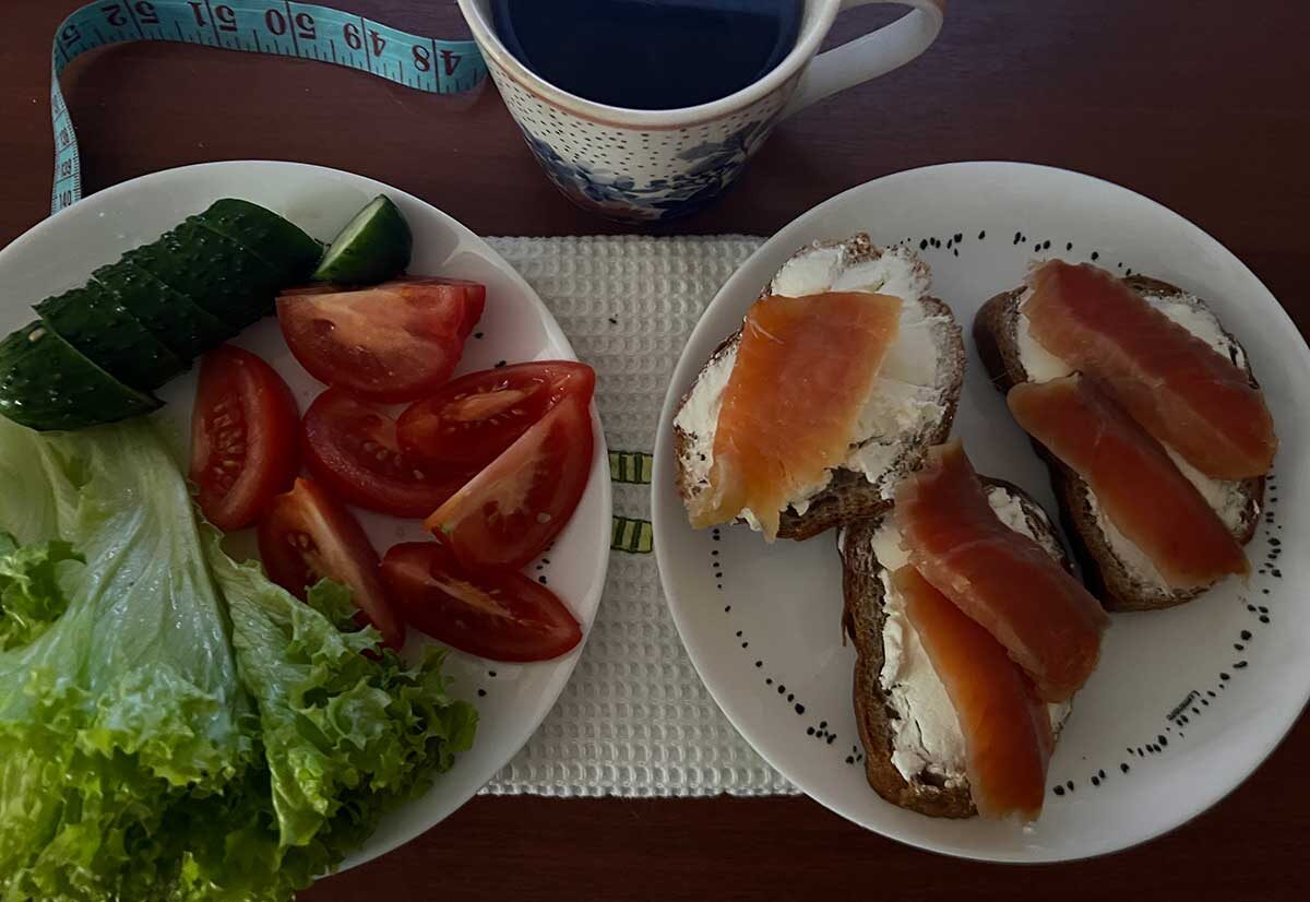 Сегодня, хоть и не четверг, решили внести разнообразие и устроить свой рыбный день. На завтрак были приготовлены аппетитные бутерброды с нежной слабосоленой форелью и творожным сыром. Как же без свежих овощей!