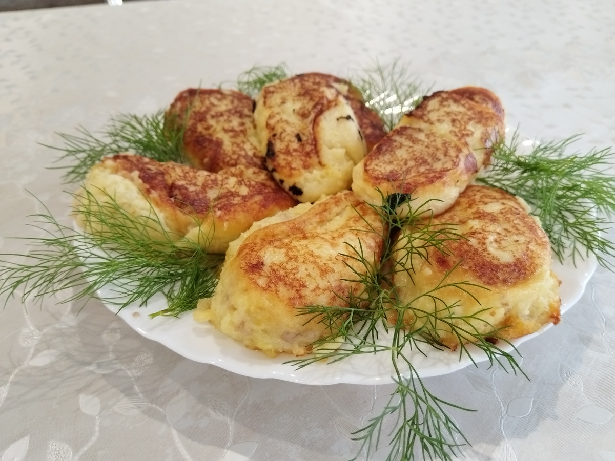 Из картофельного теста сформируйте лепёшки, увлажняя руки для удобства. В центр каждой лепёшки добавьте начинку, аккуратно соедините края и сформируйте заготовку. Обваляйте каждую зразу в панировочных сухарях.
