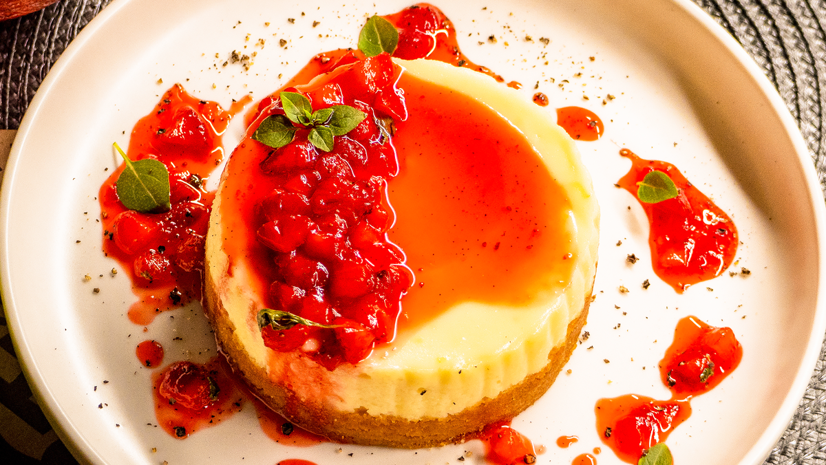 С помощью блендера измельчите печенье до состояния крошки и смешайте его с растопленным сливочным маслом.Вместе с пергаментом получите форму: уложите крошку на дно металлических колец на противне, утрамбуйте.В отдельной миске соедините творожный сыр с 60 г сахара, лимонной цедрой и яйцом, перемешайте венчиком до однородности.Извлеките семена из стручка ванили и добавьте их в сырный крем, тщательно перемешайте.Из пергамента сделайте бортики для чизкейка и вставьте их в кольца, заполните формочки сырной смесью.Выпекайте в заранее разогретой до 180°C духовке в течение 20 минут.В сотейнике смешайте оставшийся сахар, сок лимона и стручок ванили. Туда же добавьте нарезанную кубиками клубнику и базилик.Доведите до кипения и варите 3 минуты, затем остудите.Когда чизкейк остынет, аккуратно выньте его из форм, полейте клубничным конфитюром и украсьте базиликом и молотым перцем.Да будет ваше чаепитие незабываемым!