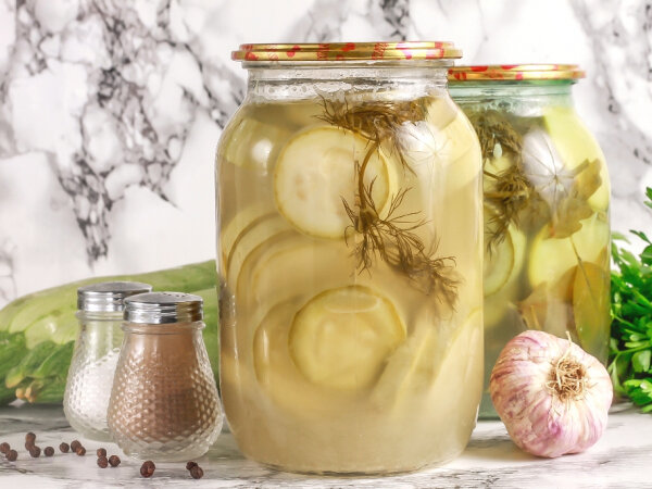 Хорошо промойте кабачки и укроп, уберите остальные листья, затем верните кабачки с укропом в банки и залейте кипящим рассолом. Закройте банки крышками.