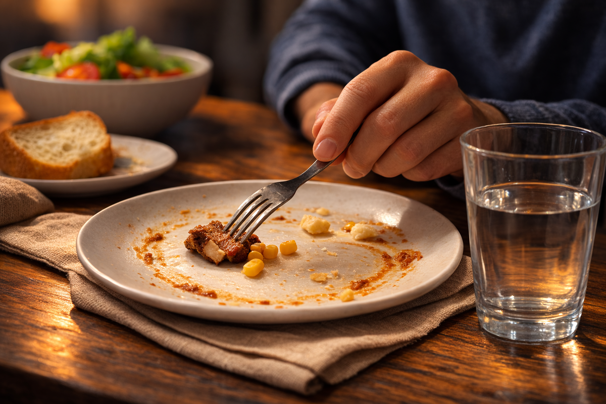 Есть ещё один интересный механизм: человек зачастую ест не столько для насыщения, сколько чтобы завершить процесс. Исследования показывают: порции большего размера приводят к тому, что люди едят больше, несмотря на уровень голода. Пустая тарелка становится сигналом о завершении трапезы.