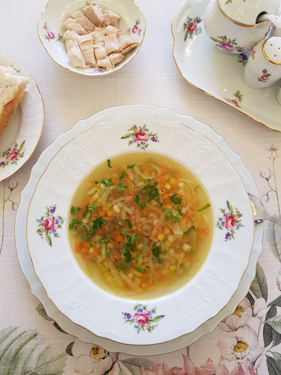 4. Готовые овощи раскладывают по тарелкам, заливают горячим консоме и посыпают нарезанной петрушкой.