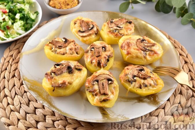 Поэкспериментируйте с картофельными "лодочками", фаршированными сырно-грибной начинкой, или удивите гостей свиными рулетиками с беконом и яблоками.