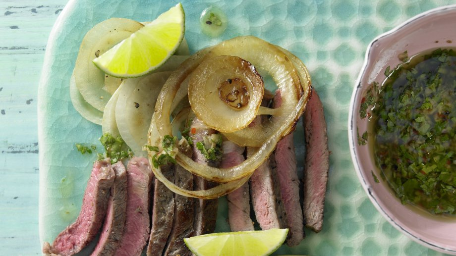 Стейки нарежьте на тонкие ломтики, раскладывайте их по тарелкам, поливайте острейшим соусом и подавайте с обжаренным луком и дольками лайма. Приятного аппетита!