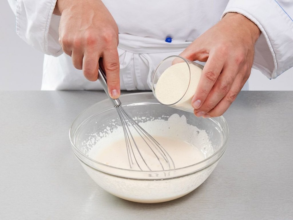 Приготовим блинчики в большом количестве, ведь они универсальны. Сначала взбейте яйца с 100 мл молока, затем добавьте смесь в муку. Не забудьте добавить сахар и соль, а затем тщательно перемешайте, постепенно вливая оставшееся молоко.
