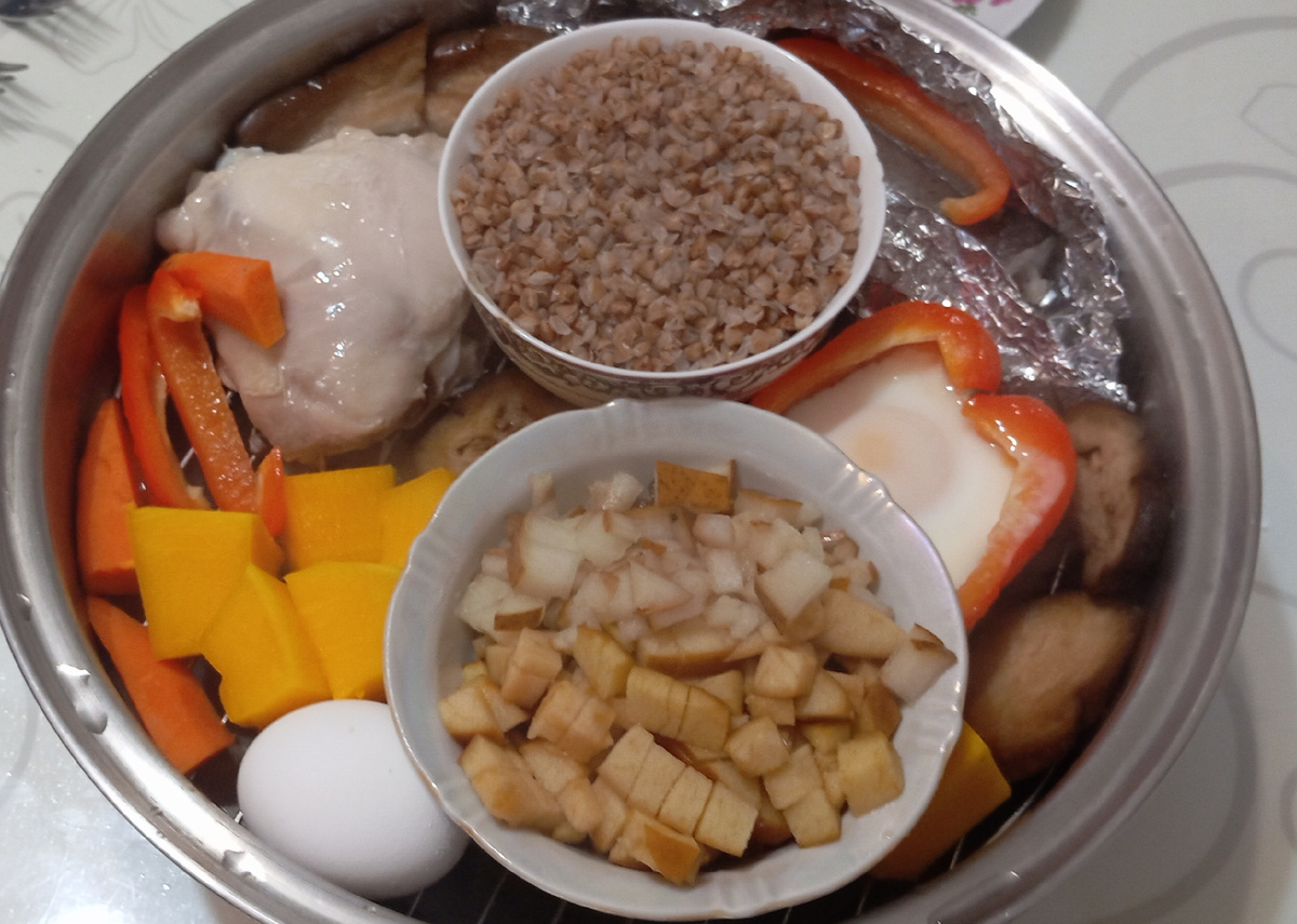 На верхний ярус положили: гречку с водой, разнообразные овощи (баклажаны, морковь, болгарский перец и тыкву), куриное бедро без специй, рыбу хек в фольге, половинку сладкого перца с разбитым яйцом и десерт из кубиков яблока, груши, тыквы и сухофруктов. Всё это прикрыли крышкой и поставили на сильный огонь. После закипания нагрев уменьшили до минимума, запустив систему Vitalok.