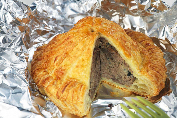 5. На круг теста положите фарш. Обмажьте края яйцом, накройте вторым кругом и аккуратно защипите. Убедитесь, что в крышке есть небольшое отверстие для выхода пара, и украсьте ее линиями ножом. Уберите в холодильник на полчаса.
