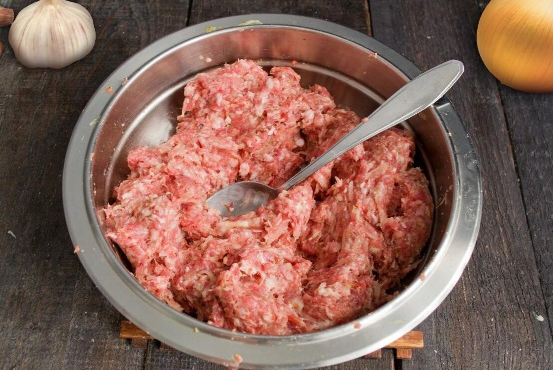 Начните с мелкой нарезки лука, для удобства его можно измельчить в блендере. Часть подготовленного лука смешайте с фаршем, добавив соль и перец для улучшения вкуса. Эта комбинация лука и фарша придаст 'грузинчикам' особую сочность.