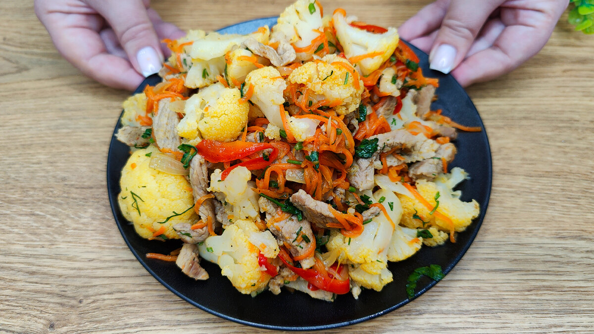 На том же растительном масле, где жарилось мясо, обжариваем овощи 3–4 минуты до мягкости. Затем возвращаем в казан готовую цветную капусту и обжаренное мясо, тщательно перемешиваем и тушим около 10 минут, периодически помешивая.