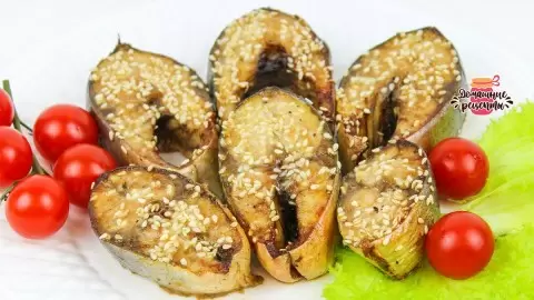 Форму для запекания следует смазать оливковым маслом, выложить замаринованные стейки на дно и посыпать кунжутом. Запекать блюдо в предварительно разогретой до 180 градусов духовке в течение 30 минут, пока тунец не станет золотистым и готовым.