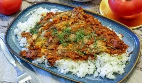 В сковороду добавляются специи: лавровый лист, перец и гвоздика, и тушение продолжается еще 15 минут. В конце вливается уксус, создающий дополнительный вкус. На дно жаропрочной формы выкладывают половину соуса, затем помещают камбалу и накрывают оставшейся частью маринада. Форму нужно накрыть фольгой и поставить в предварительно разогретую духовку на 40 минут.