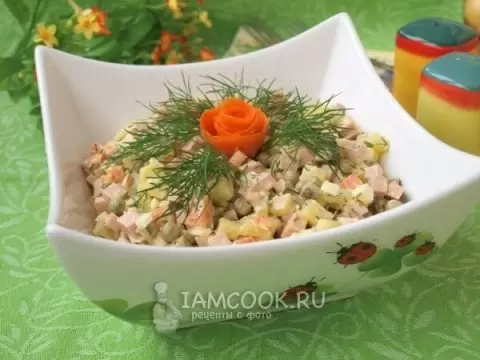Естественно, блюда на новогоднем столе отличались в зависимости от семейных предпочтений, но многие из них стали символами праздника. Самым популярным блюдом считался салат Оливье, который неизменно готовился с вареной колбасой, солеными огурцами и горошком. В более обеспеченных семьях иногда добавляли свежие овощи, но большинство ограничивалось урожаем лета.