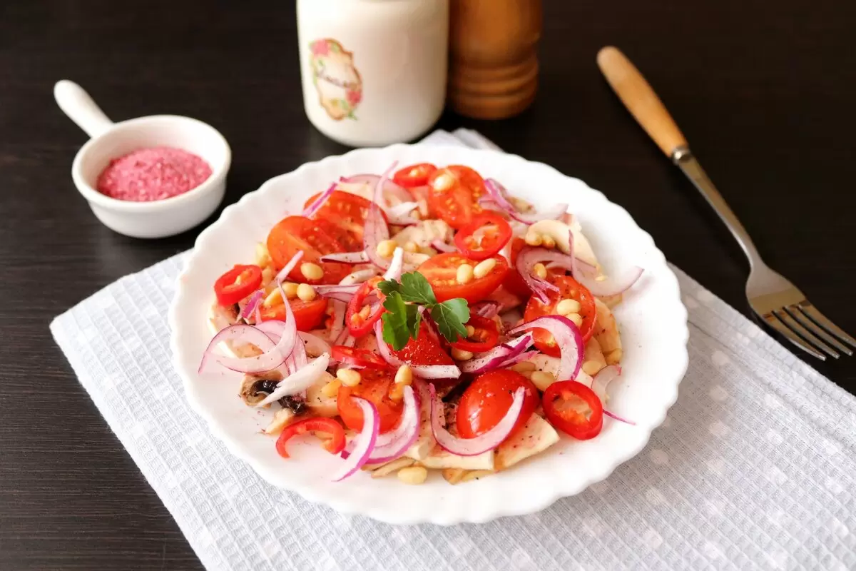 Предлагается оригинальный и легкий салат с свежими шампиньонами, помидорами и кедровыми орешками. Эта закуска будет интересна тем, кто ценит нетрадиционные блюда, ведь в ней используются сырые грибы. Важно выбрать самые свежие и крепкие шампиньоны, чтобы блюдо удалось на славу.