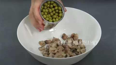 Приступая к приготовлению, сначала нужно нарезать селедку, затем добавить консервированный зеленый горошек. После этого следует довершить блюдо добавлением нарезанного лука и немного ароматного подсолнечного масла. Просто перемешать, и салат готов к подаче!
