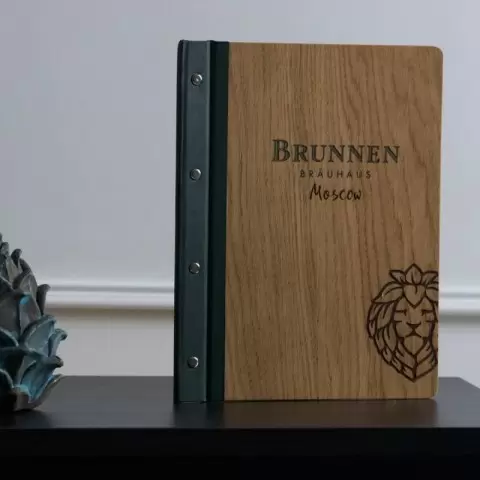 Дизайн ресторана удивляет гармонией натуральных текстур и модернистского стиля. Основное меню, оформленное в деревянной папке, наглядно демонстрирует симбиоз традиций и современности. Каждый элемент, начиная от оформления страниц до теплых тонов, создает атмосферу, где каждая деталь рассказывает свою историю.