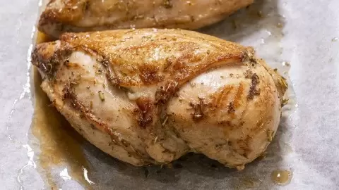 После окончания маринования, аккуратно разместите грудку на бумажном полотенце, чтобы удалить лишнюю влагу и избавиться от остатка розмарина. Разогрейте сковороду с небольшим количеством масла и обжаривайте курицу шкурой вниз до получения золотистой корочки с обеих сторон. После этого переложите грудку на противень, предварительно застеленный пергаментом, и поставьте в заранее разогретую до 160 градусов духовку на 10 минут.