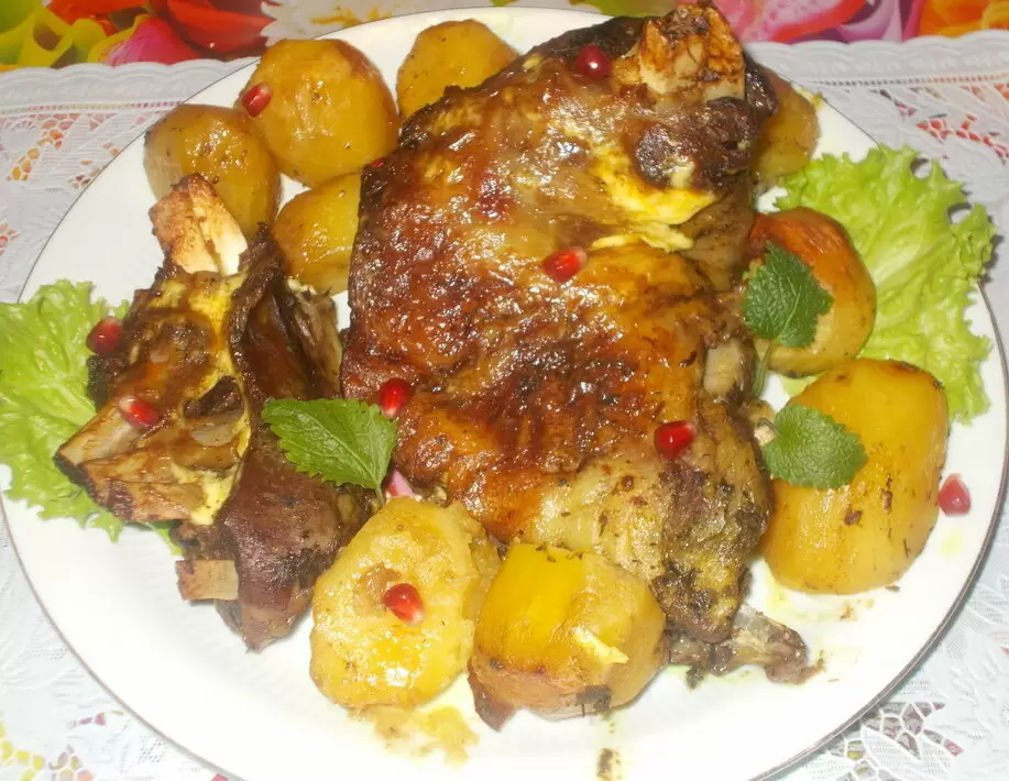После маринования баранью ногу следует разместить в форме для запекания. Для дополнительного вкуса нужно сделать еще несколько проколов и полить их растительным маслом и оставшимся маринадом. Картофель, нарезанный крупными кусками, выкладывается рядом с мясом.
