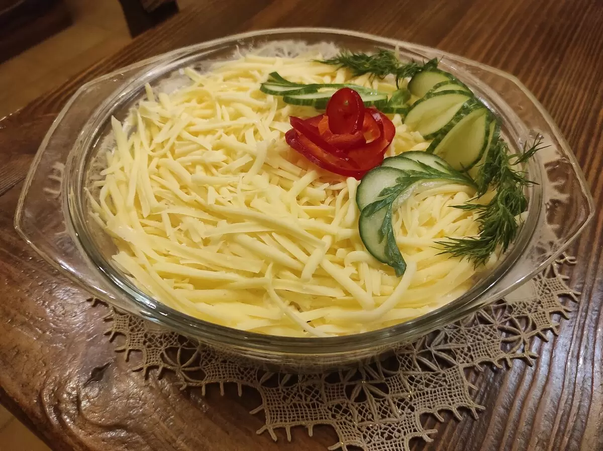 Эффектный вид слоями в стеклянной салатнице создаст сногсшибательный акцент на столе, а текстура с нежным верхом и хрустящим луком не оставит никого равнодушным. Попробуйте этот салат и добавьте его в своё празднование! Приятного аппетита!