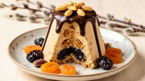 После этого пасху оставляют в холодильнике на 10-12 часов до полного застывания. Перед подачей стоит аккуратно перевернуть десерт на сервировочное блюдо, снять марлю и украсить растопленным шоколадом и арахисом в глазури.