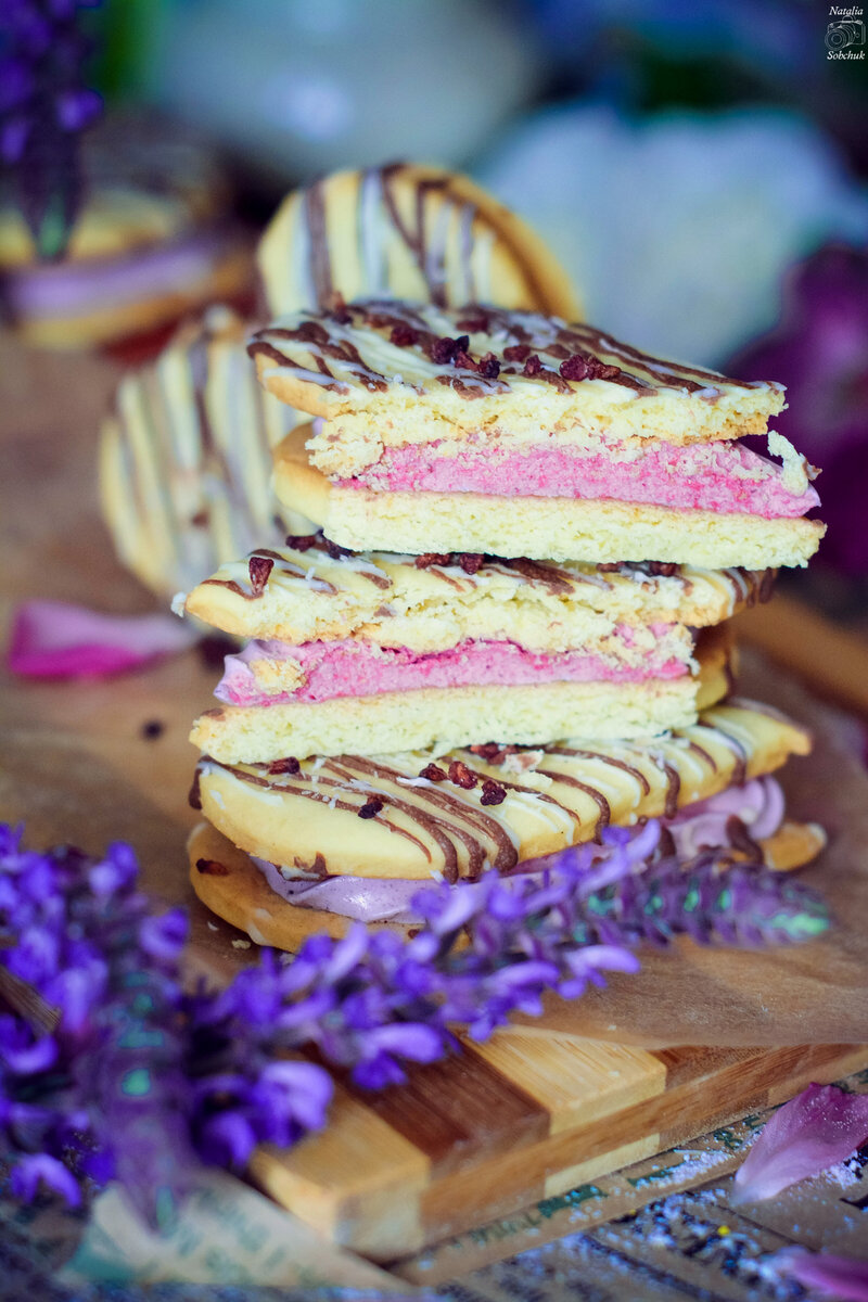 2. Зефирная начинка: Смешайте ягодное пюре с лимонной кислотой и белком, взбивая до пышной массы. В отдельной кастрюле сварите сироп из агар-агара, сахара и воды до 110°С. Постепенно влейте горячий сироп в ягодную массу, продолжая взбивать на высокой скорости до загустения. Перелейте массу в кондитерский мешок и отсадите зефир на одну половинку печенья, затем накройте другой частью. Дайте застыть в течение 8-10 часов.