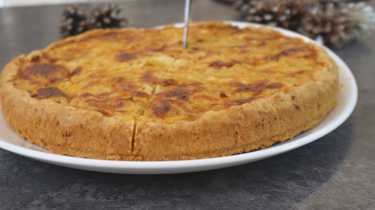 Основа теста требует холодного масла и аккуратного замеса — именно так оно держит форму и не тает под рукой. Начинка собирается за пару минут: жареный лук, сырые яйца и тертый сыр, перемешанные до однородности. В форму отправляется ровной шапкой тесто, поверх него кладется мягкая, ароматная начинка, и пирог отправляется в духовку на умеренную температуру.