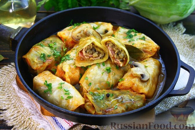 - Голубцы с копчёной грудинкой и грибами. Эти сочные голубцы, завернутые в нежные листья капусты, отлично дополнены аппетитной начинкой из копчёной грудинки и обжаренных грибов. Они станут настоящей точкой притяжения на любом столе.