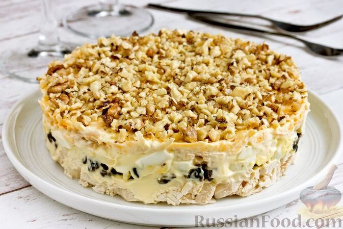 1. Салат с куриным филе, ананасами и черносливом удивит даже самых искушённых гурманов. Пикантные маслины и насыщенные оттенки сладкого чернослива делают это блюдо уникальным и запоминающимся.